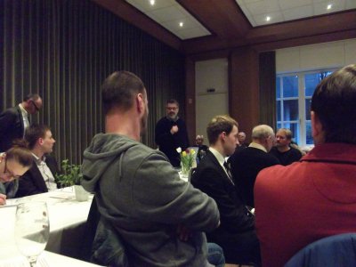 Danach ging Herr Droste zu seinem Platz an die andere Seite des Saales. Kurz danach kam auch Eckard Hilker und nahm hinter uns Platz. Der Saal wurde so voll, dass zusätzlich Stühle aufgestellt werden mussten. Pünktlich um 19:00 Uhr hat Herr Christoph ![]()