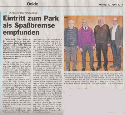 zu ihrer Entschlusskraft und ihrem Weitblick: „Ihre Nachfahren werden ihnen noch nach Jahrhunderten Dank dafür wissen!“ Danach sprach Herr Dr. Wohlbrück und stellte die Forderungen der Initiative und das damit eingehende Bürgerbegehren zur Öffnung des Parks vor. Danach wurde Eckard Hilker, Vorsitzender des Fördervereins Vier-Jahreszeiten-Park, gebeten sich auch darüber zu äußern. Herr Hilker erklärte, dass sie befürchten, im bewirtschafteten Teil des Parks das Gleiche zu erleben wie im unbewirtschafteten Teil. Helmut Droste erklärte, dass der Park Eigentum aller Oelder Steuerzahler sei und damit muss dieser für jeden frei zugänglich sein. Genau diese Meinung vertrat auch Herr Rainer Fust von der SPD. Viele Anwesende haben sich zu Wort gemeldet und ihre Meinungen offen geäußert. Eine Frau sagte dazu, dass sie seit der Landesgartenschau den Park aus Prinzip nicht betreten hat, weil sie für ihr Eigentum Eintritt zahlen muss. Die Versammlung endete kurz nach 20:00 Uhr.