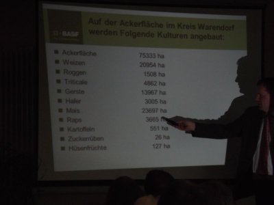 Danach referierte Herr Klaus Fölling über den Pflanzenschutz, führte mittels Leinwand mehrere Bilder vor und erklärte den Anwesenden die vielen Gesichter der Landwirtschaft, sprach über die Bioenergie, die man als Verbrennungsmittel benutzen kann, und über den Wachstum der Landwirtschaft in den letzten Jahren in Deutschland. Er sprach auch über die Rückstände im Honig, die für den Verbraucher kein Problem sind. Die Rückstände im Honig seien so gering, dass, um die schädliche Wirksamkeit der Pflanzschutzmittel für einen Menschen zu erreichen, dieser 20 kg Honig auf einmal essen müsste.