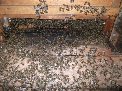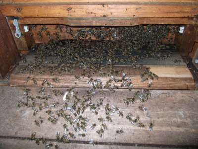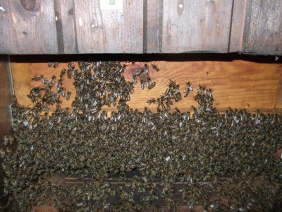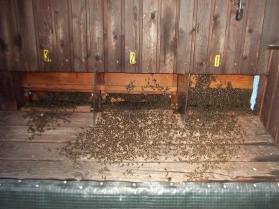 Styropor gegen die Kälte und Wärme verkleidet habe, wird innen des Bienenhauses nicht so warm. Trotzdem wird es im Stock so warm, dass die Bienen durch Fächeln den Stock abkühlen müssen. Abends, nachdem sie vom Fliegen zurückkehren, können sie sich im Stock nicht aufhalten und sammeln sich vor dem Flugloch, wo es kühler ist als im Stock. Gestern Abend gegen 21:30 Uhr, als ich vor dem Bienenhaus stand, sah ich, wie sich die Bienen aller drei Völker, die ich besitze, draußen vor den Fluglöchern gesammelt hatten. In der Luft, schon 80 cm vor den Fluglöchern, konnte ich die Ameisensäure riechen. Obwohl ich einen kleinen Docht eingesetzt habe, verdunstet durch die Wärme mehr AS, als es sein sollte. Das kann auch ein Grund sein, dass die Bienen sich gestört fühlen und die Nacht vor dem Flugloch verbringen. Ich holte die Kamera und habe zur Erinnerung einige Bilder gemacht.